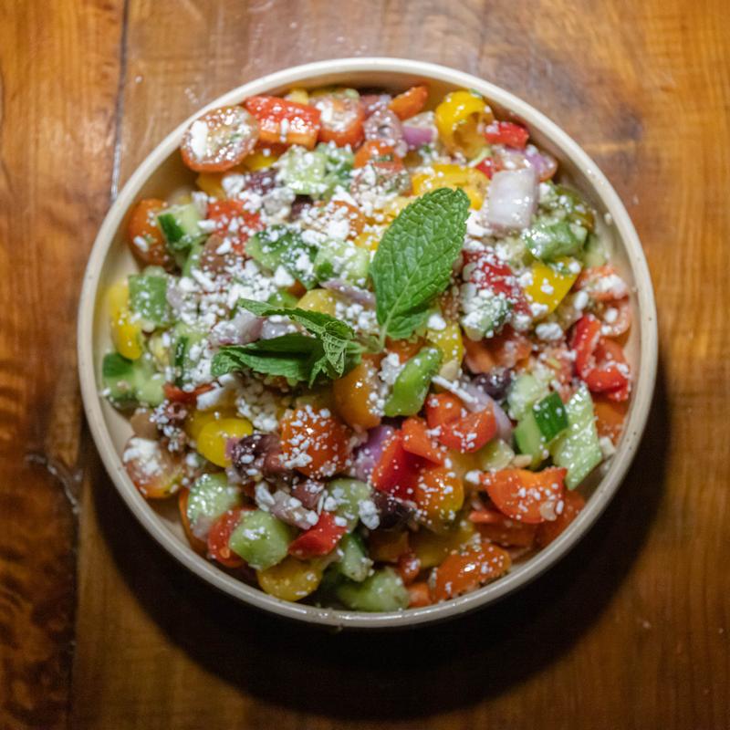 Fresh Cherry Tomatoes, Cucumbers, Red Onions, and Kalamata olives Tossed in a Mint-Lemon Greek Vinaigrette Topped With Sheep Feta Cheese & Pita Croutons